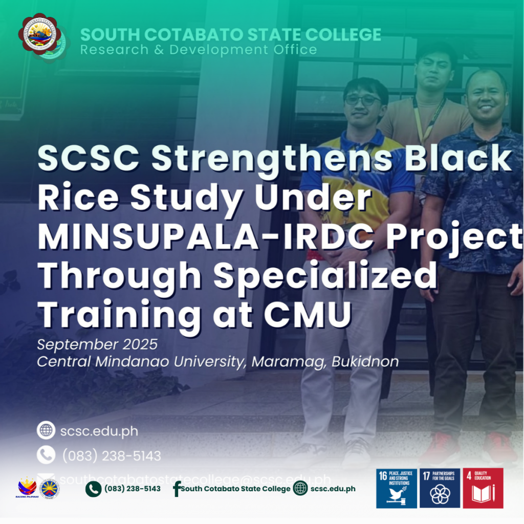 As part of its commitment to the 𝙈𝙞𝙣𝙙𝙖𝙣𝙖𝙤 𝙎𝙪𝙡𝙪 𝙋𝙖𝙡𝙖𝙬𝙖𝙣—𝙄𝙣𝙣𝙤𝙫𝙖𝙩𝙞𝙫𝙚 𝙍𝙚𝙨𝙚𝙖𝙧𝙘𝙝 𝘿𝙚𝙫𝙚𝙡𝙤𝙥𝙢𝙚𝙣𝙩 𝘾𝙤𝙣𝙨𝙤𝙧𝙩𝙞𝙪𝙢 (𝙈𝙄𝙉𝙎𝙐𝙋𝘼𝙇𝘼-𝙄𝙍𝘿𝘾), the South Cotabato State College (SCSC) Research and Development Unit has advanced its study on indigenous crops through a five-day Training-Workshop on Phytochemical Profiling and Antioxidant Property Determination held from September 22 to 26, 2025 at Central Mindanao University (CMU), Maramag, Bukidnon.