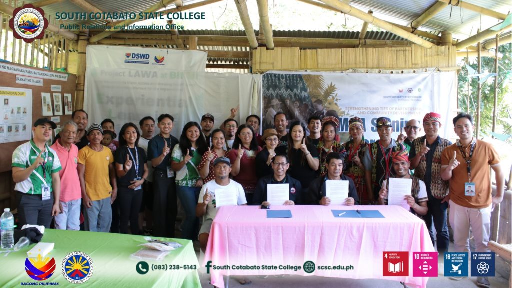 The successful MOA Signing held on December 5, 2025 at Brgy. Luhib, Lake Sebu, South Cotabato formally established the partnership between South Cotabato State College (SCSC) and local farmersโ€™ associations to advance bamboo agroforestry and indigenous seed development, reaffirming the Collegeโ€™s commitment to provide sustained technical assistance, capacity building, and research-based support to the Katipunan ng Magsasaka para sa Yamang-Lupa ng El-Alis (KAMAY ng El-Alis) and the El-lumet Indigenous People Farmers Association (ELIPFA).