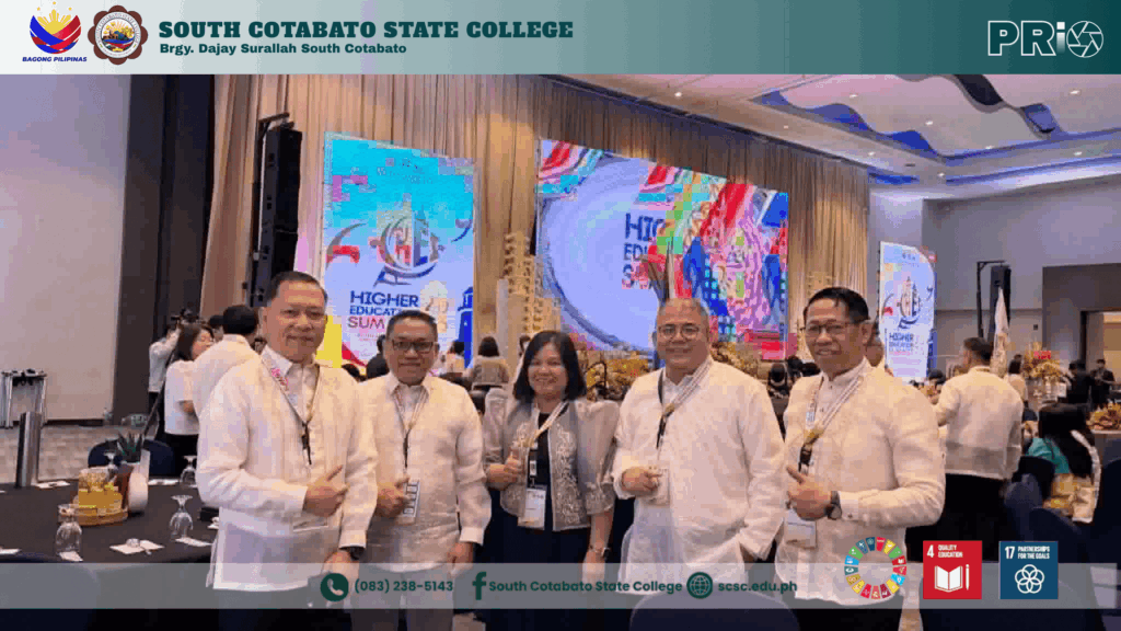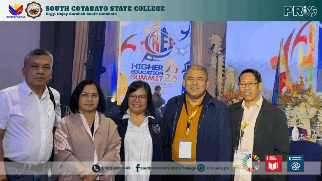 South Cotabato State College successfully participated in the Higher Education Summit 2026 (HES 2026) held at the SMX Convention Center, Clark, Pampanga, bringing together leaders and representatives from State Universities and Colleges (SUCs), Local Universities and Colleges (LUCs), and private Higher Education Institutions (HEIs) across the country.
