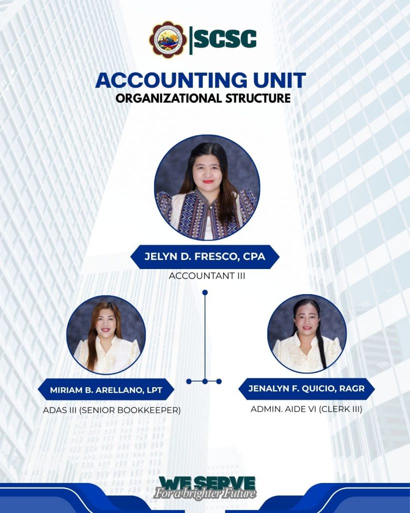 The SCSC Accounting Unit is responsible for managing and safeguarding the financial resources of the College through accurate recording, monitoring, and reporting of all financial transactions. It ensures compliance with government accounting and auditing rules, prepares and maintains financial statements, disbursement records, and obligation reports, and processes payments, payroll, and other financial claims in a timely and transparent manner. The unit also supports budget execution, coordinates with oversight agencies for financial submissions, and provides reliable financial data to management for informed decision-making, promoting accountability and fiscal integrity within the institution.
