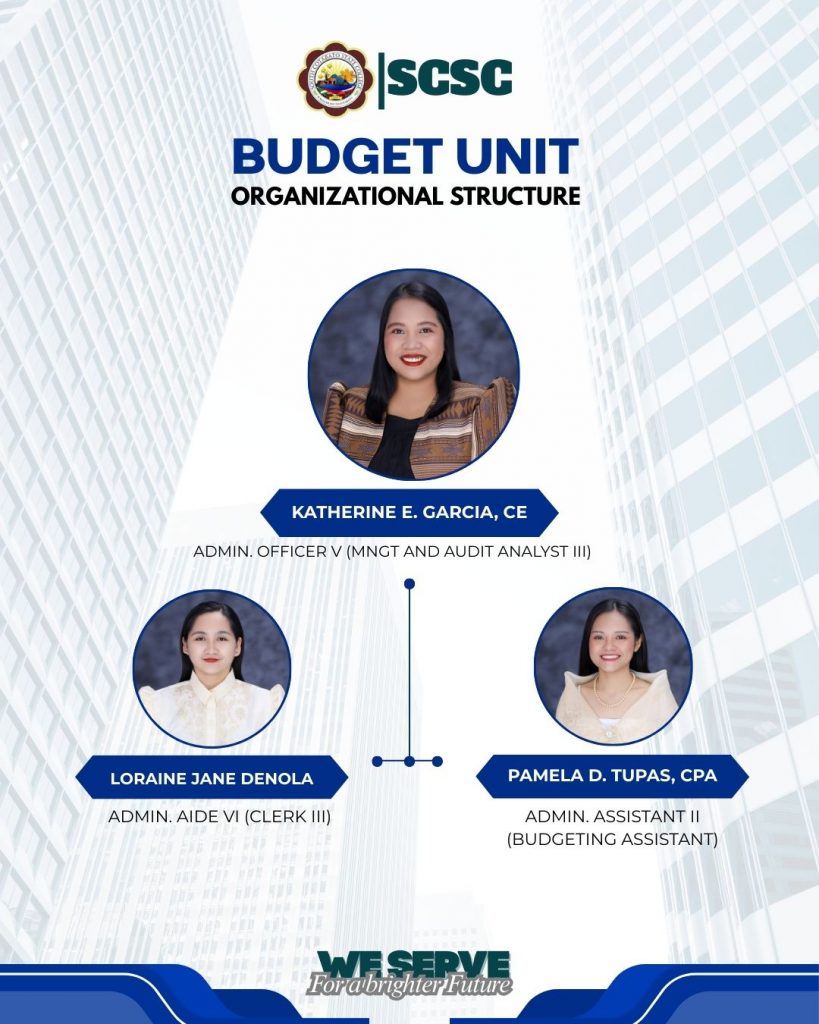 The SCSC Budget Unit is responsible for preparing, reviewing, and consolidating the College’s annual budget in alignment with institutional priorities and government budgeting policies. It monitors budget utilization, ensures that all expenditures are within approved appropriations, and issues budget certifications to support financial transactions. The unit coordinates with departments to assess funding needs, conducts budget hearings, and provides technical guidance on budget preparation and execution. It also prepares periodic budget reports for management and oversight agencies, ensures compliance with DBM and COA regulations, and promotes fiscal discipline, transparency, and efficient resource allocation to support the College’s programs and operations.