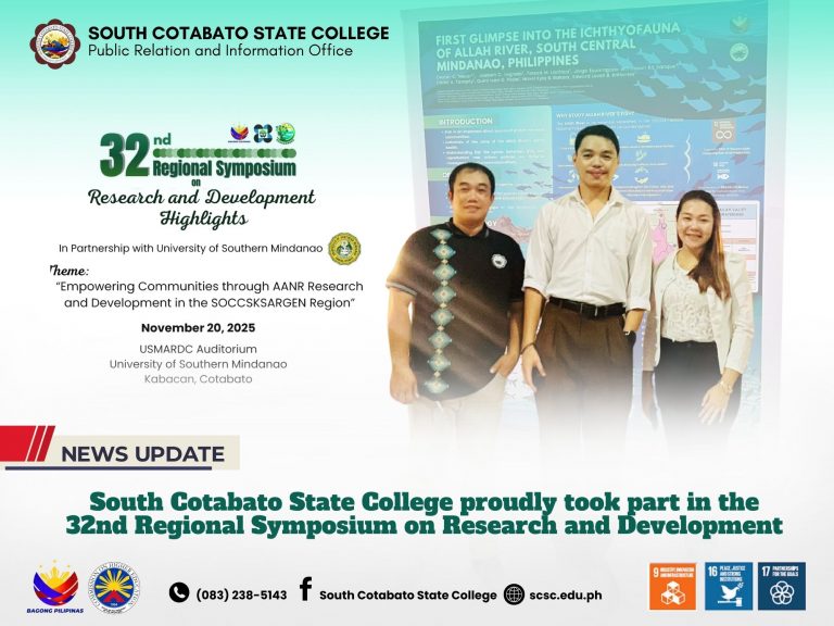 USM Kabacan, Cotabato – South Cotabato State College proudly took part in the 32nd Regional Symposium on Research and Development Highlights organized by SOXAARRDEC, an annual gathering that continues to strengthen research culture and collaboration across the region. Guided byโ€ฆ