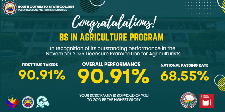 Surallah, South Cotabatoย  – South Cotabato State College (SCSC) proudly celebrates the exceptional performance of its Bachelor of Science in Agriculture program in the November 2025 Licensure Examination for Agriculturists. Out of 33 examinees, 30 successfully passed, giving the collegeโ€ฆ