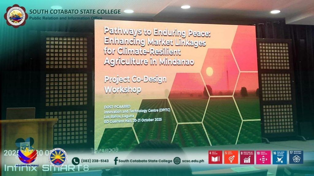 South Cotabato State College, through its Director for Extension Services, Mr. Nikki C. Cordero, MAST, attended the Project Co-Design Workshop on โPathways to Enduring Peace: Enhancing Market Linkages for Climate-Resilient Agriculture in Mindanaoโ held on October 21โ22, 2025, at the DOSTโPCAARRD Innovation and Technology Center (DPITC), Los Baรฑos, Laguna.