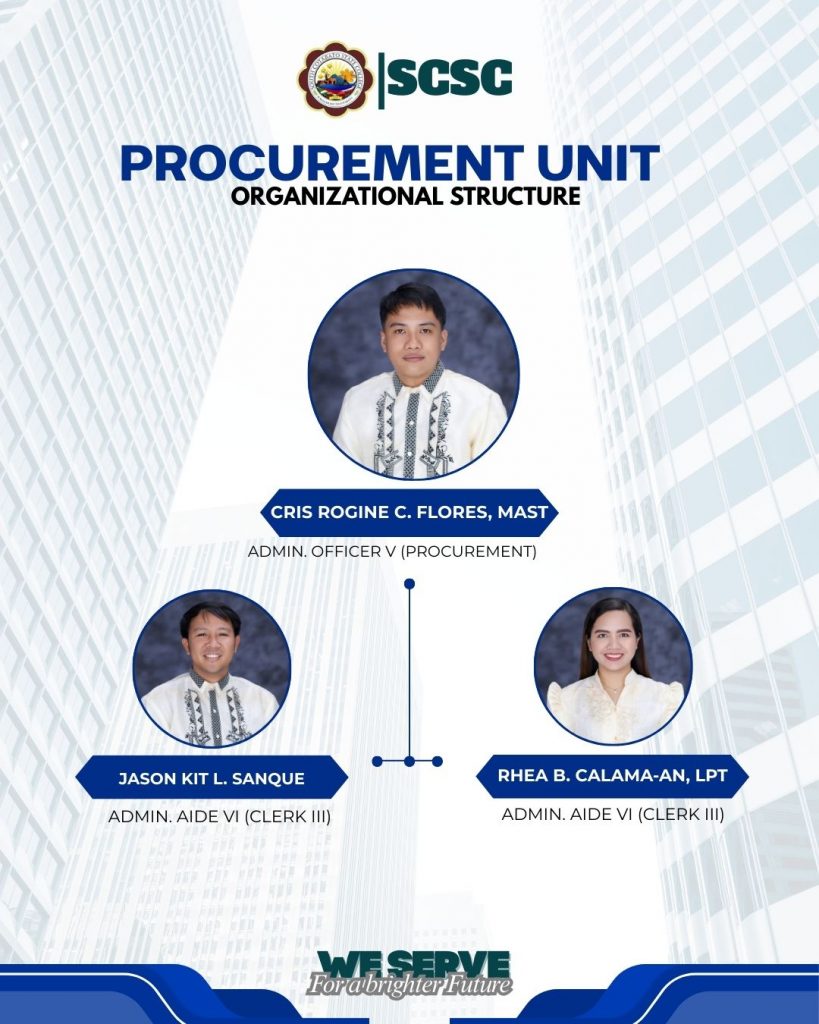 The SCSC Procurement Unit is responsible for facilitating the transparent, efficient, and lawful acquisition of goods, services, and infrastructure projects required by the College. It ensures that all procurement activities strictly follow RA 9184 and its Implementing Rules and Regulations, from planning and bidding to contract preparation and awarding. The unit manages procurement documents, conducts market research, coordinates with end-users to determine needs, and oversees supplier evaluation and contract monitoring. It maintains accurate procurement records, prepares reports for oversight agencies, and promotes accountability, competitiveness, and value-for-money in all transactions to support the College’s operational and developmental goals.