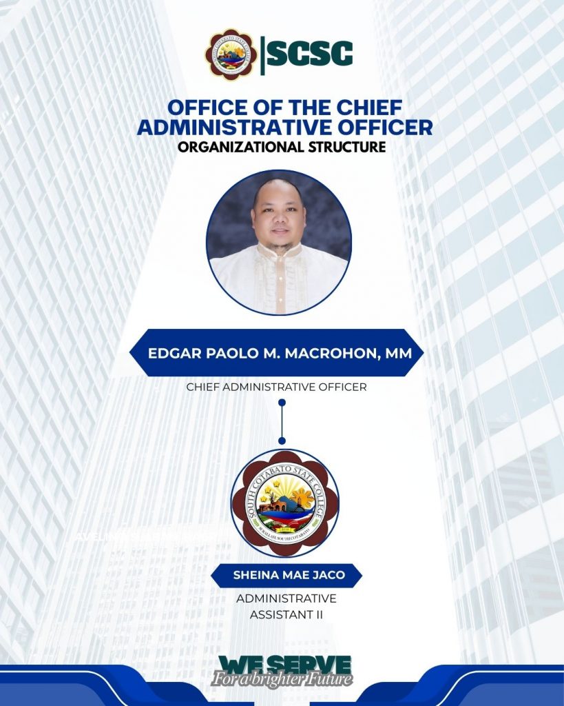 The SCSC Office of the Chief Administrative Officer (CAO) is responsible for overseeing and managing the College’s administrative operations to ensure efficient, effective, and compliant service delivery. It supervises support services including human resources, general services, records management, and other administrative units, ensuring adherence to government rules, regulations, and institutional policies. The office coordinates interdepartmental activities, facilitates policy implementation, and provides technical guidance to enhance operational efficiency. Additionally, it monitors performance, addresses administrative concerns, and supports the College President in decision-making to promote accountability, transparency, and the smooth functioning of the institution.