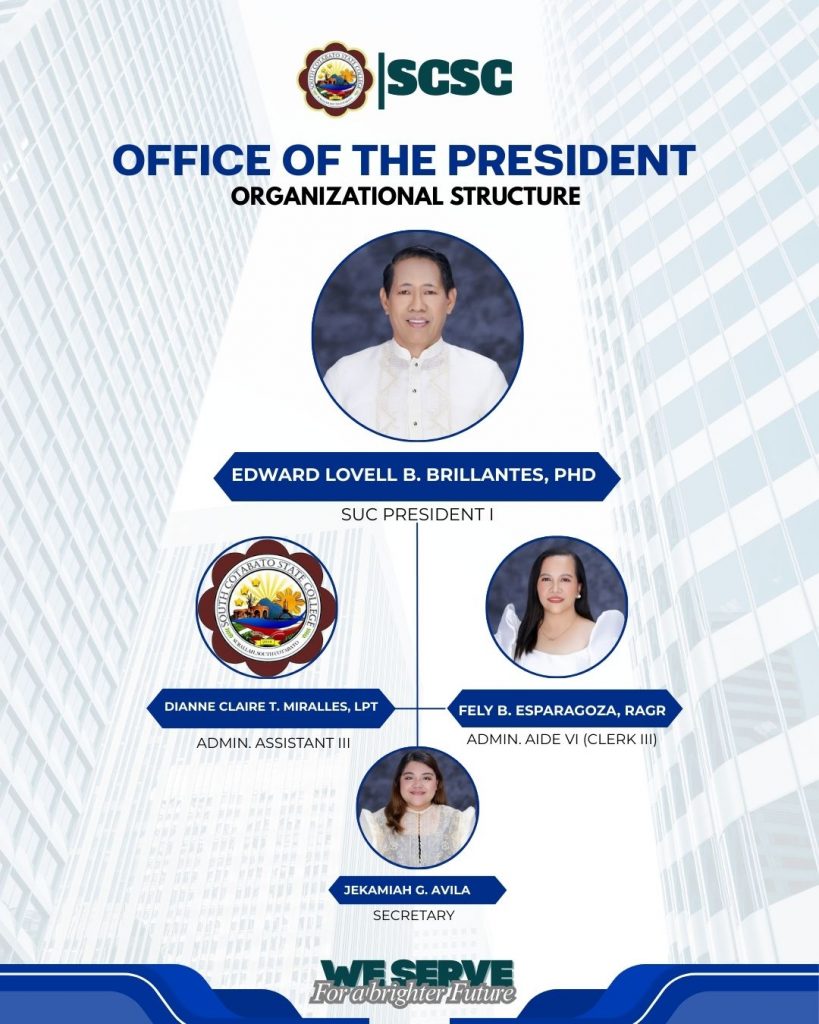 The SCSC Office of the President is responsible for providing overall leadership, strategic direction, and governance to ensure the effective management and development of the College. It formulates institutional policies, oversees academic and administrative operations, and ensures compliance with national education laws and regulations. The office represents the College in official functions, coordinates with government agencies and stakeholders, and promotes partnerships to advance institutional goals. Additionally, it monitors performance across departments, provides guidance and support to administrative and academic units, and fosters a culture of excellence, accountability, and continuous improvement to achieve the College’s vision and mission.