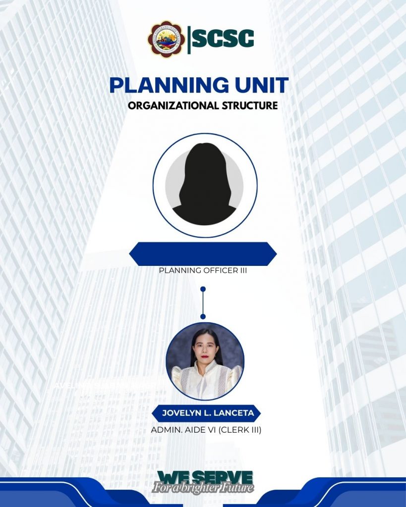 The SCSC Planning Unit is responsible for developing, coordinating, and monitoring the strategic and operational plans of the College to ensure alignment with its vision, mission, and government policies. It conducts research, collects data, and analyzes institutional performance to inform policy formulation, program development, and decision-making. The unit prepares annual and long-term plans, monitors the implementation of projects and programs, and evaluates outcomes to assess effectiveness and impact. It also provides technical guidance to departments, ensures compliance with planning standards, and supports evidence-based management to promote institutional growth, resource optimization, and sustainable development.